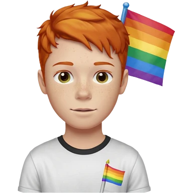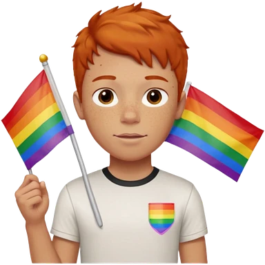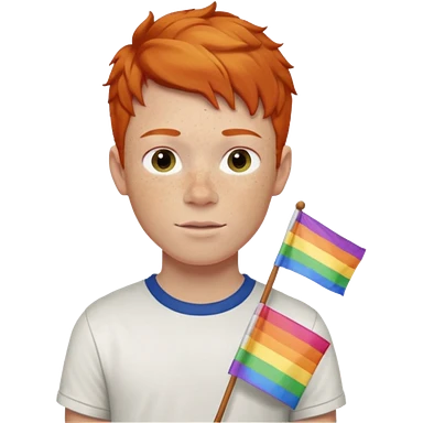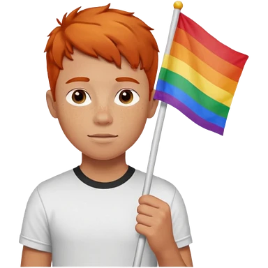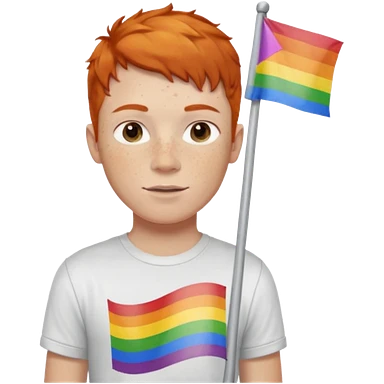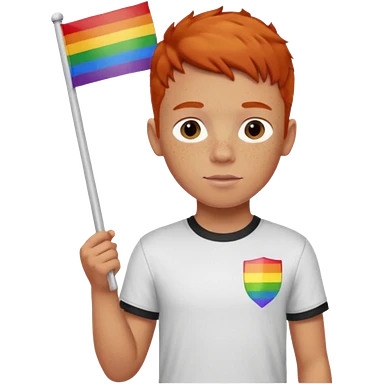 A gay, ginger, young, freckled, boy with a shirt with JUDE on it holding a pride flag emoji