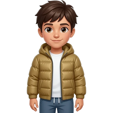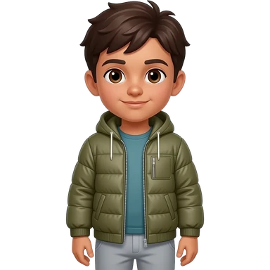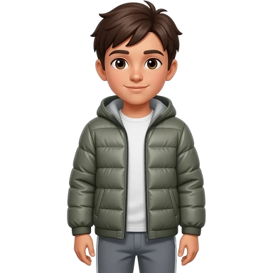 Make a Boy with slightly brown skin color, brown eyes and dark brown hair. He is wearing a Softshell Jacket and Sweatpants. emoji