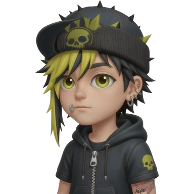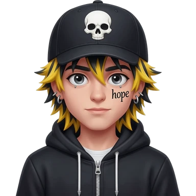 boy japan spiky long yellow black hair, hoodie zip is vignetteskullcap wear piercings tatto "hope" emoji