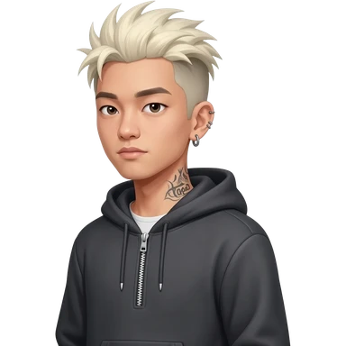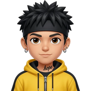 japan boy with spiky hair and black hoodie zip one-sided earrings tattoo with the word "hope". emoji