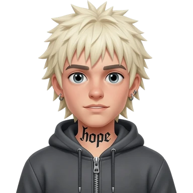 Create for me a boy wearing a zip-up hoodie showing his shirt underneath, with long, spiky platinum blonde hair, piercings, and the word "hope" tattooed on his eyebrow. emoji