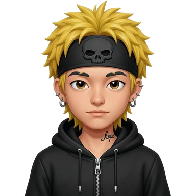 boy japan spiky long platinum gold hair, hoodie zip is vignette skull wear piercings tatto "hope" emoji | AI Emoji Generator