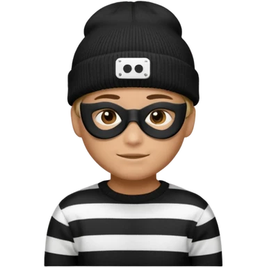 boy emoji with black knit beanie, thin black domino mask, and a black-and-white horizontally striped sweater emoji