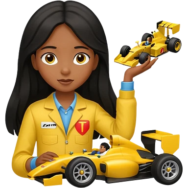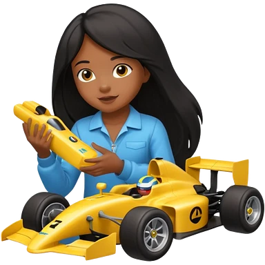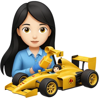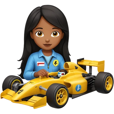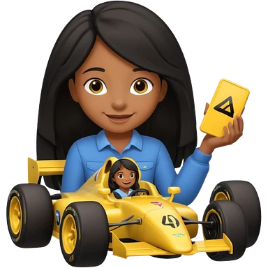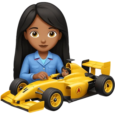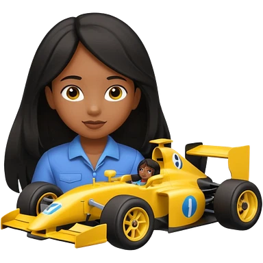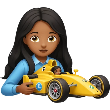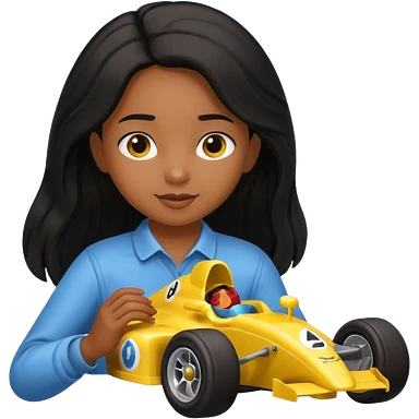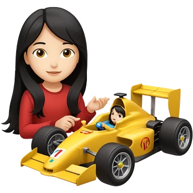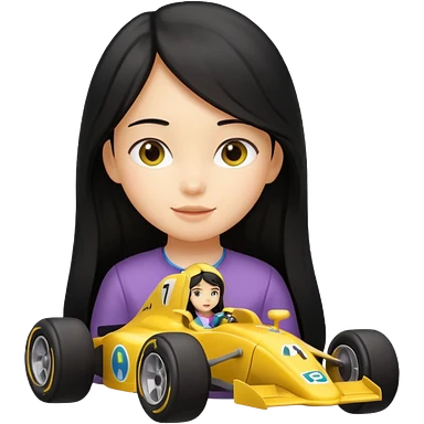 black long black haired girl kid playing yellow colored formula 1 car toy emoji
