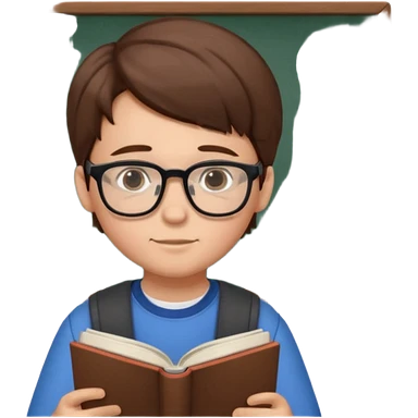a 12-year-old boy with brown hair and gray eyes wearing glasses and a white shirt is sitting at a desk at school emoji