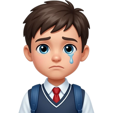 Create an emoji of a young boy student crying. He is wearing a school uniform, including a shirt and pants, and has short hair. The boy is visibly upset, with tears streaming down his face, and he is wiping his eyes with his hand. The background should be simple to emphasize his emotional state, conveying the feeling of being overwhelmed with school stress or personal struggles emoji