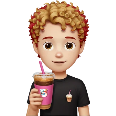 Boy white skin wearing cool black shirt with red words, boy has curly brown hair with blonde highlights give him a Dunkin iced coffee in hand. emoji