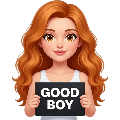 sexy girl with long wavy ginger hair and ginger eyes wearing a white tanktop is holding a black colored sign with GOOD BOY written on it emoji