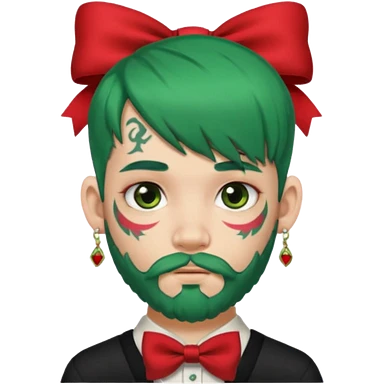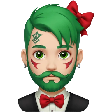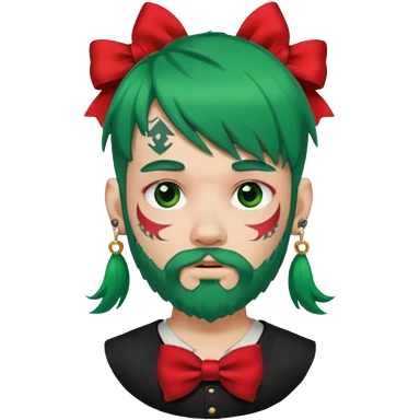 boy with bangs and green hair and red hairbow on side and earrings and very heavy face tattoos and beard emoji