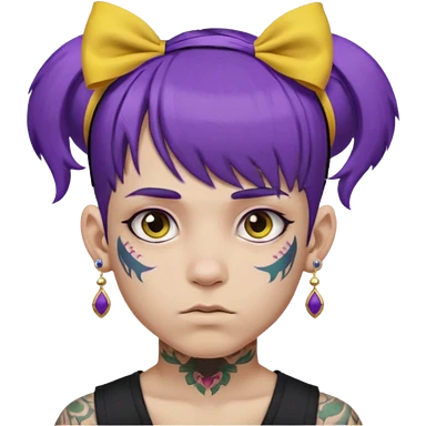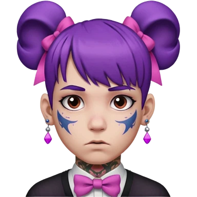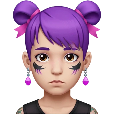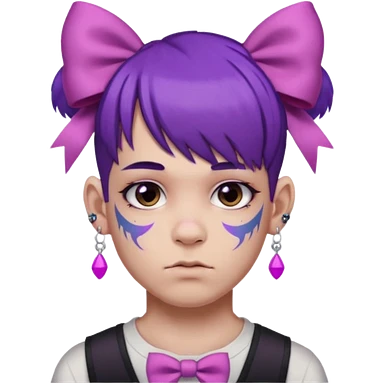 boy with bangs and purple hair and pink hairbow on the side of head and earrings and very heavy face tattoos emoji | AI Emoji Generator