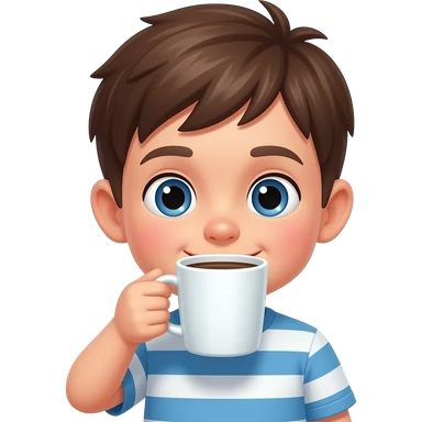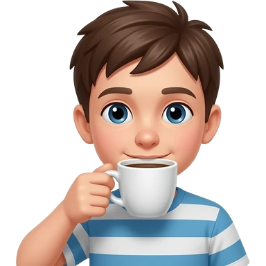 a boy with short hair, having scarf, drink coffee, enjoy emoji