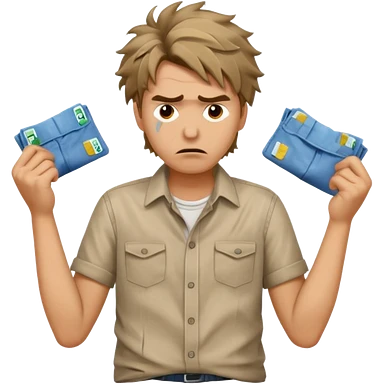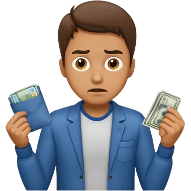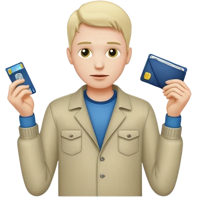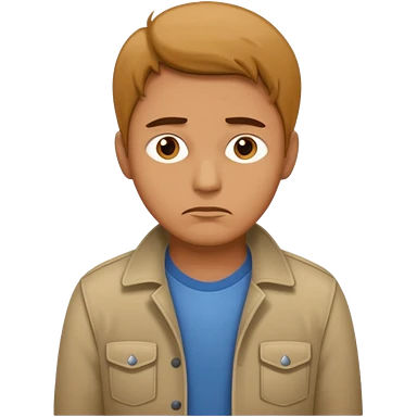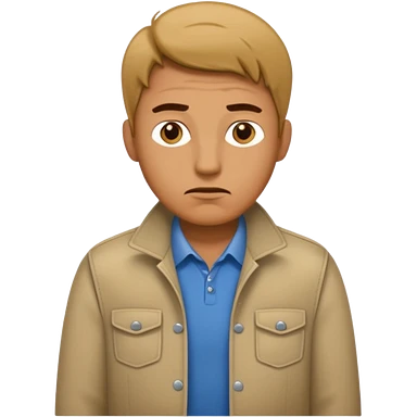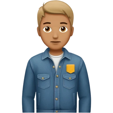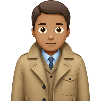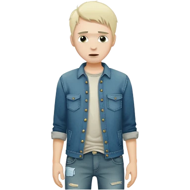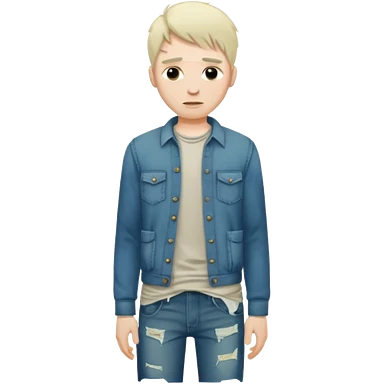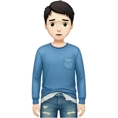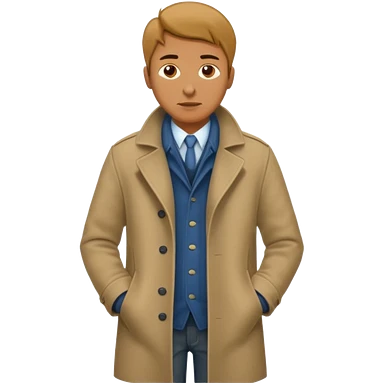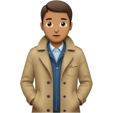 a full body brunette boy with his hands in the pockets of a long blue coat and a house behind him far away emoji