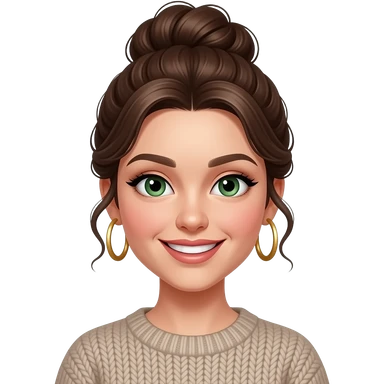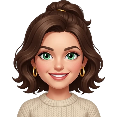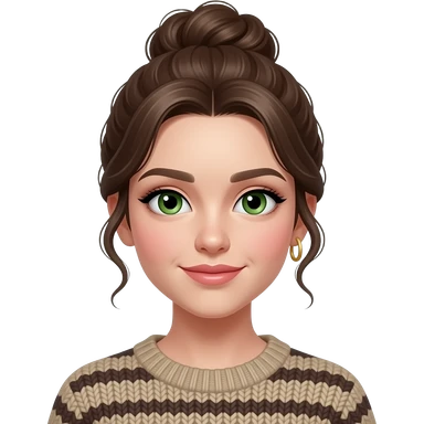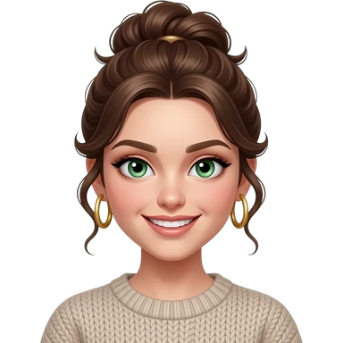 fille brune 18 ans, yeux verts, cheveux en chignon haut ondulés,maquillage, botox, pull, anneaux dorés aux oreilles emoji