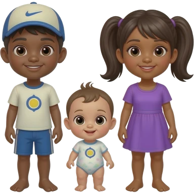 Busy Beach One Dark Skin Boy And Sun Cap and normal Hair With swim shorts One Ponytails girl With Purple Dress one baby and woman dark skin with baby swim shirt emoji