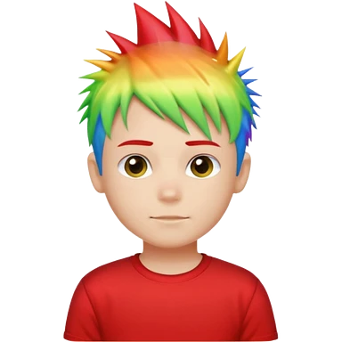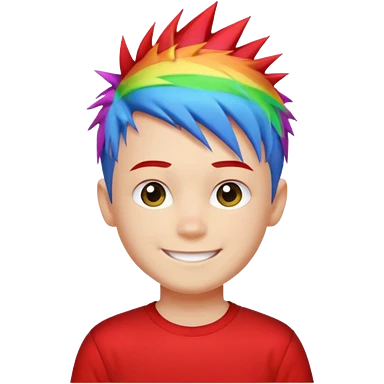 Boy with rainbow streaks — short spiky hair glowing under light, red T-shirt emoji