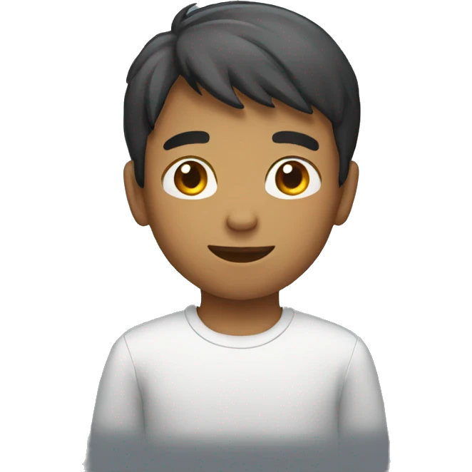 Young boy, with dark hair and brown eyes, without a beard, smiling and with a computer. Dressed in a long-sleeved navy blue shirt, without a front pocket. emoji