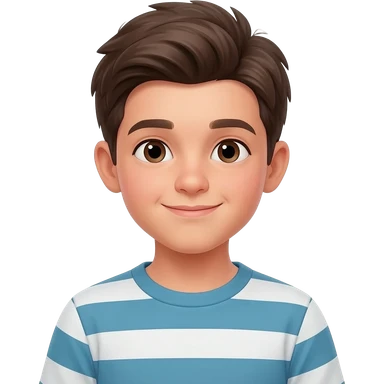 Boy with dark brown hair, combed neat, parted to the side and brown eyes. Wearing a video game themed shirt and red shorts outfit with matching sneakers. emoji