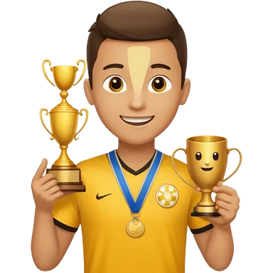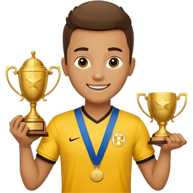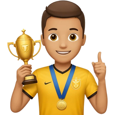 happy soccer player with a first-place medal and a trophy in yellow t-shirts emoji