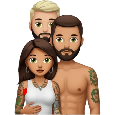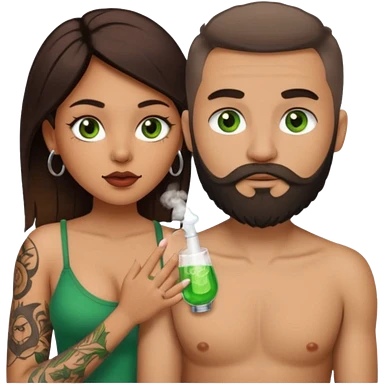 Brown eyed Latina woman with pierced nipples and tattoos having sex white a white man with green eyes and a beard emoji