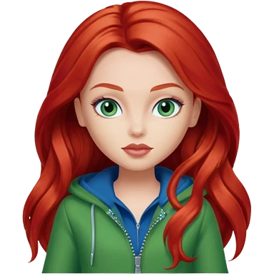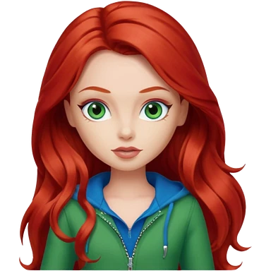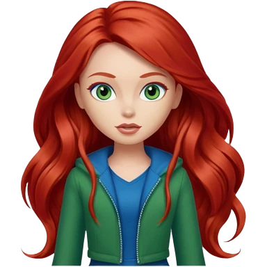 Bratz Meygan red long hair blue eyes, green outfit emoji