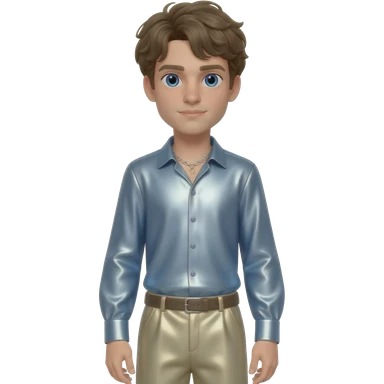 Brady Corbet with blue eyes, strawberry blonde hair, light steel blue metallic shirt, beige metallic baggy pants, silver necklace emoji | AI Emoji Generator