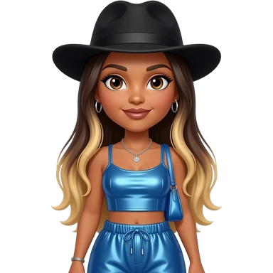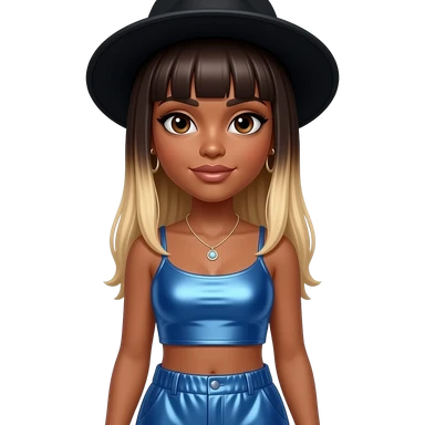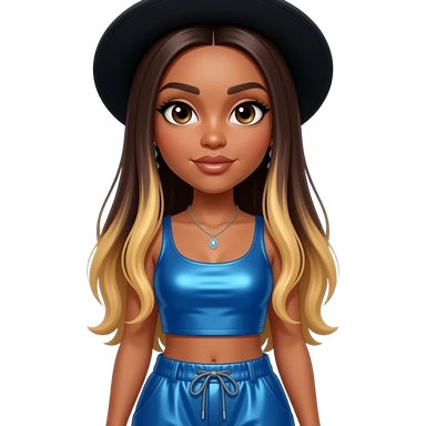Natina Reed from Blaque with dark brown eyes, long dark brown straight hair with blonde ombre, black hat, blue metallic crop top, blue metallic baggy pants, necklace and earrings emoji