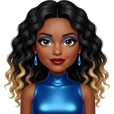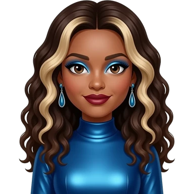 Natina Reed from Blaque with dark brown eyes, long dark brown curly hair with blonde ombre, blue eyeshadow, dark red lipstick, blue metallic high neck dress, earrings emoji