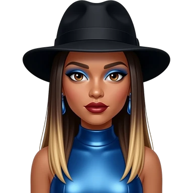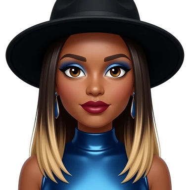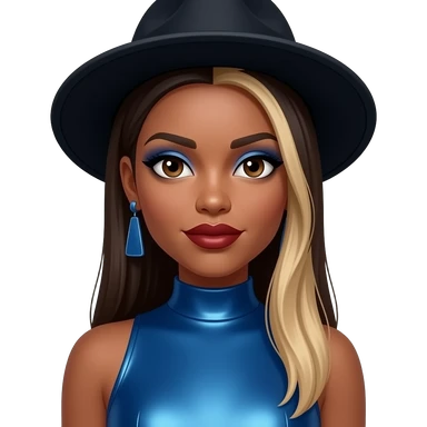 Natina Reed from Blaque with dark brown eyes, long dark brown straight hair with blonde ombre, black hat, blue eyeshadow, dark red lipstick, blue metallic high neck dress, earrings emoji