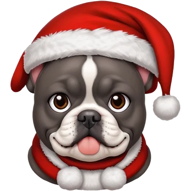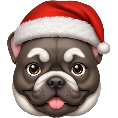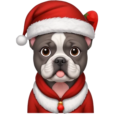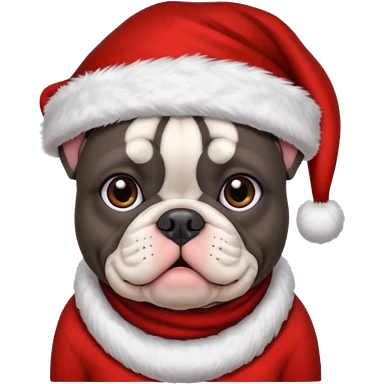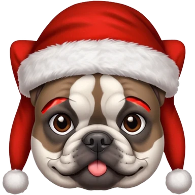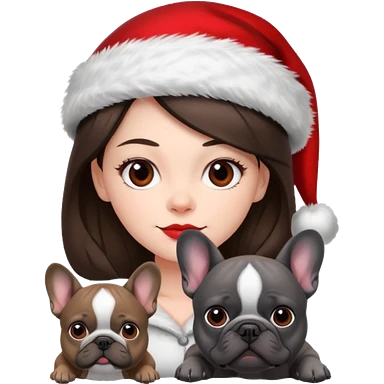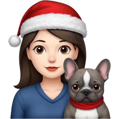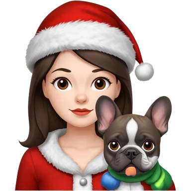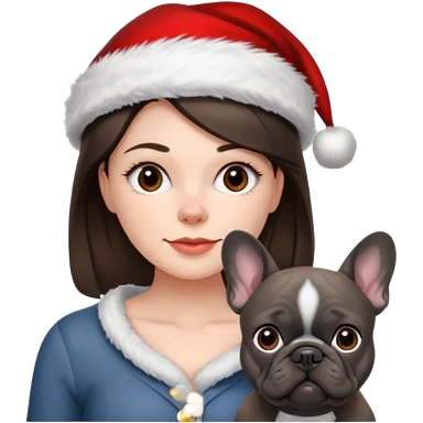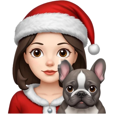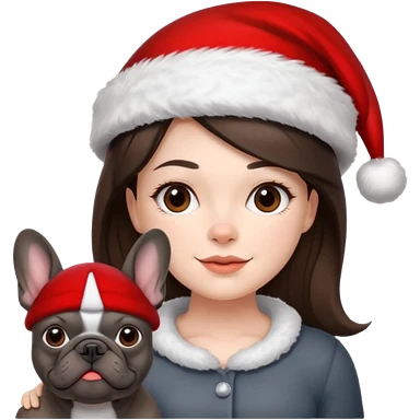 brunette woman with a dark grey French bulldog both wearing Santa emoji