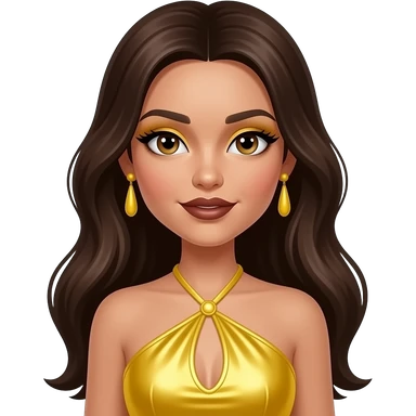 Sasha from Bratz with hazel eyes, long dark brown hair, yellow eyeshadow, dark brown lipstick, yellow metallic halter dress, yellow earrings emoji