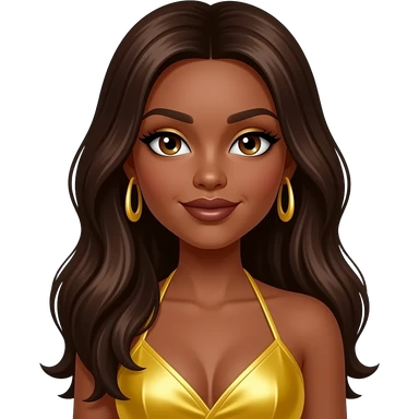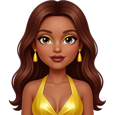 Sasha from Bratz with brown skin, hazel eyes, long dark brown hair, yellow eyeshadow, dark brown lipstick, yellow metallic halter dress, yellow earrings emoji