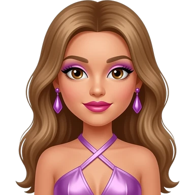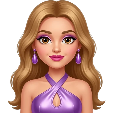 Yasmin from Bratz with brown eyes, long light brown hair, lilac eyeshadow, hot pink lipstick, lilac metallic halter dress, lilac earrings emoji