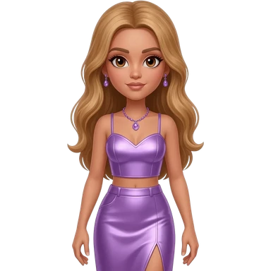Yasmin from Bratz with brown eyes, long golden brown hair, lilac metallic sweetheart crop top, lilac metallic assymetrical long skirt, lilac necklace and earrings emoji