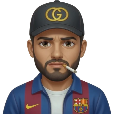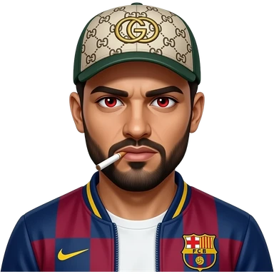 Arabe, avec joint de shit dans la bouche, et les yeux très très fatigués, veste Barca, casquette Gucci et il a l’air dangereux et menancant emoji