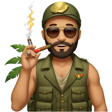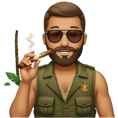 brauny vested sunglasses bearded jungle commando smoking a cigar with a grin emoji | AI Emoji Generator