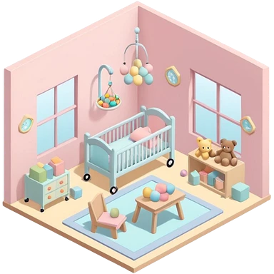 isometric baby room, Nursery with pastel walls and hanging mobile emoji