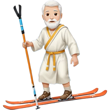 Old man white haired white beard wearing white toga robe on skis with mountains emoji