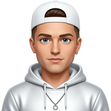 Brian Harvey from East 17 with blue eyes, brown buzz cut hair, white cap, white metallic sweatshirt, necklace and earrings emoji