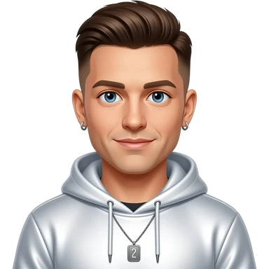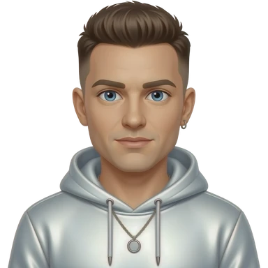 Brian Harvey from East 17 with blue eyes, brown buzz cut hair, white metallic sweatshirt, necklace and earrings emoji