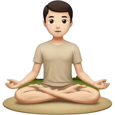 rapaz magro cabelo escuro, camiseta bege e bermuda bege escuro, corpo inteiro meditando num jardim oriental emoji