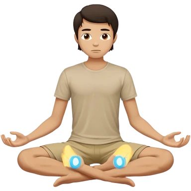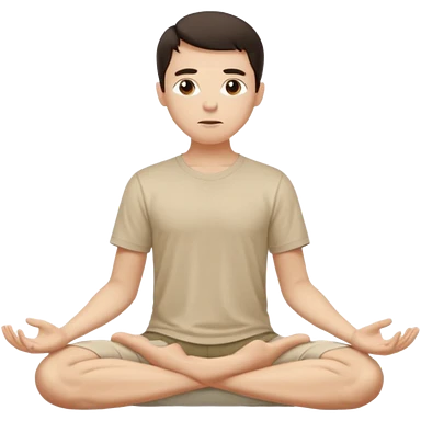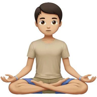 rapaz magro cabelo escuro, camiseta bege e bermuda bege escuro, corpo inteiro meditan emoji