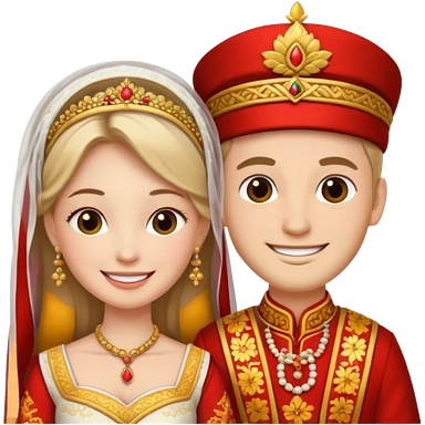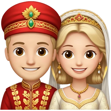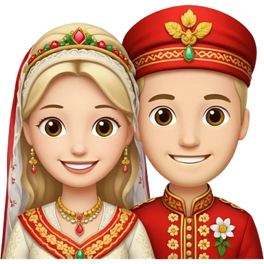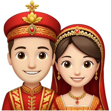 bride and groom in traditional outfit and smiling emoji