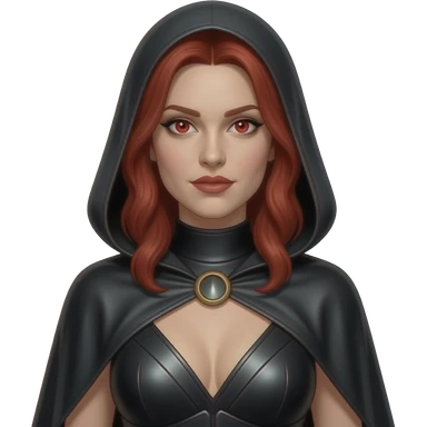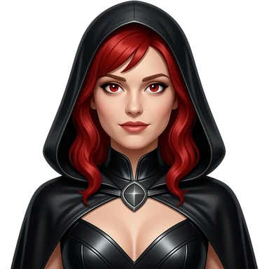 Sarah Blane from Horror Film Heroes and Villains with white and red eyes, medium red hair, black metallic caftan dress emoji