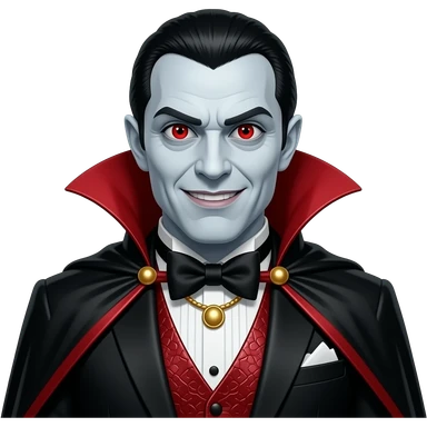 Count Dracula from Horror Film Heroes and Villains with red eyes, black hair, black metallic black suit with bow tie, red metallic vest, dark red metallic cape emoji