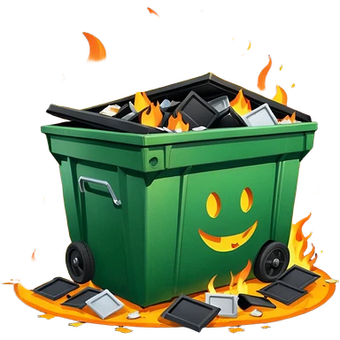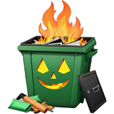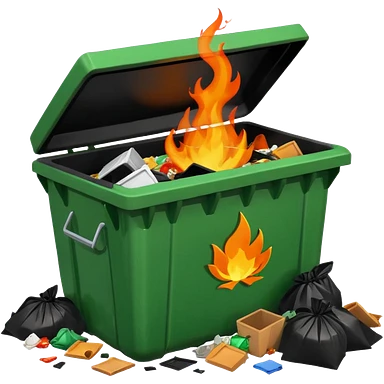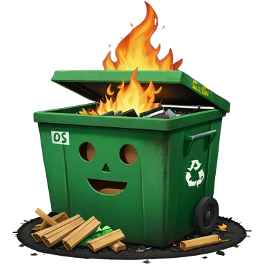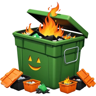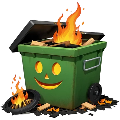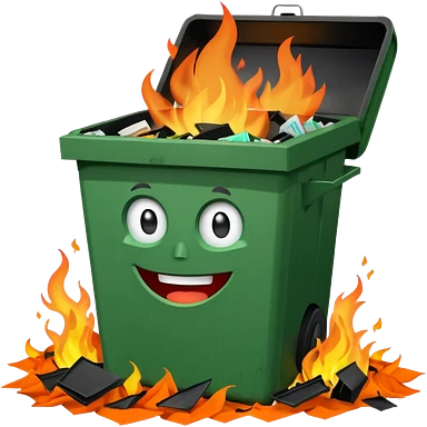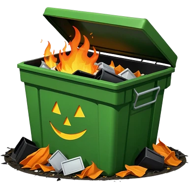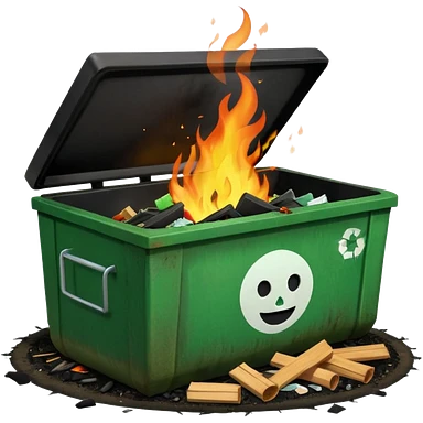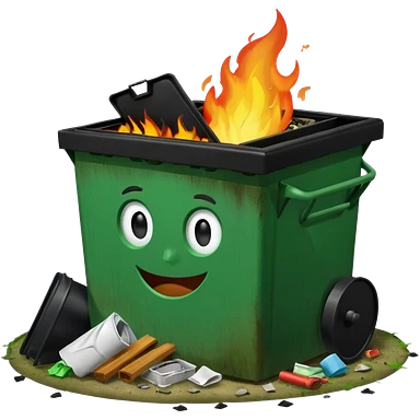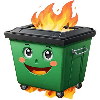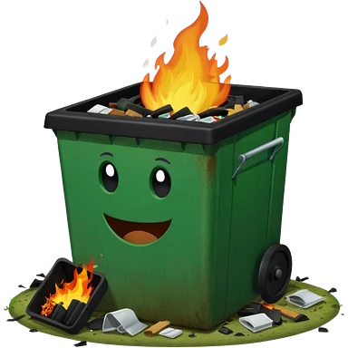 Bright green happy dumpster with an open black lid and a large fire burning only inside it. there is litter and trash on the ground around it not burning emoji | AI Emoji Generator