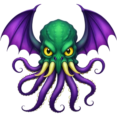deep green Cthulhu with purple bat wings and purple gradient tentacles. Yellow angry eyes. yellow suckers on tentacles. dramatic ominous shading. two saber-teeth emoji