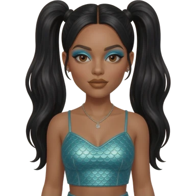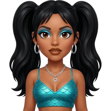 Lisa Left Eye Lopes from TLC with dark brown eyes, long black two high ponytail hair, sky blue eyeshadow, bronze lipstick, turquoise metallic mermaid crop top, silver necklace and earrings emoji