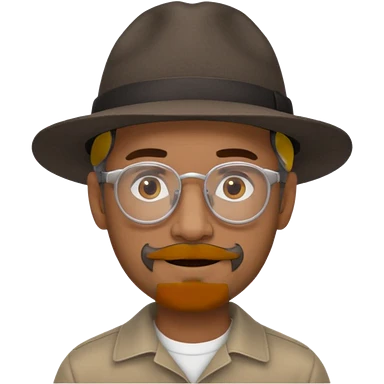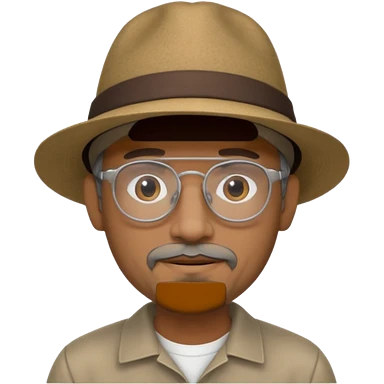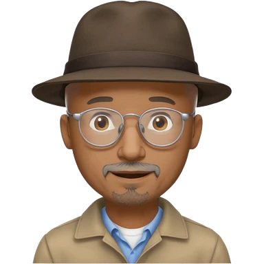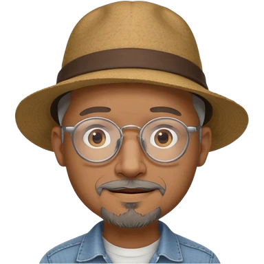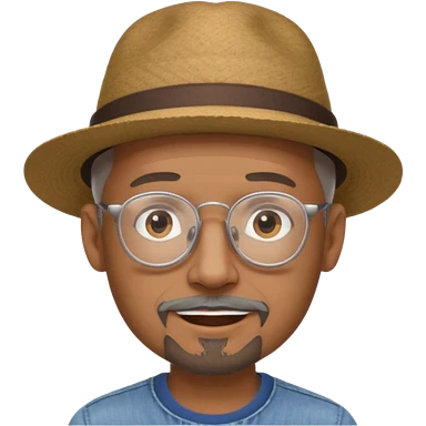 Brown man with wide rimmed hat no hair, but gray goatee, clear glasses and slightly smiling emoji
