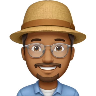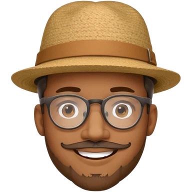 Brown man smiling not showing teeth, wide rimmed hat, clear glasses, gray goatee emoji