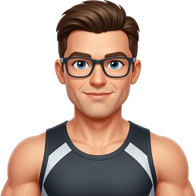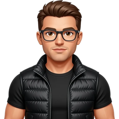 Brown hair, glasses, black gilet, brown eyes, black round neck t shirt, sporty, muscular emoji